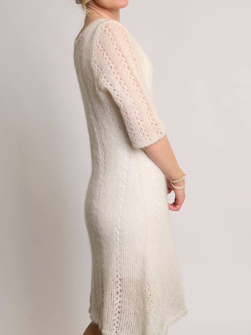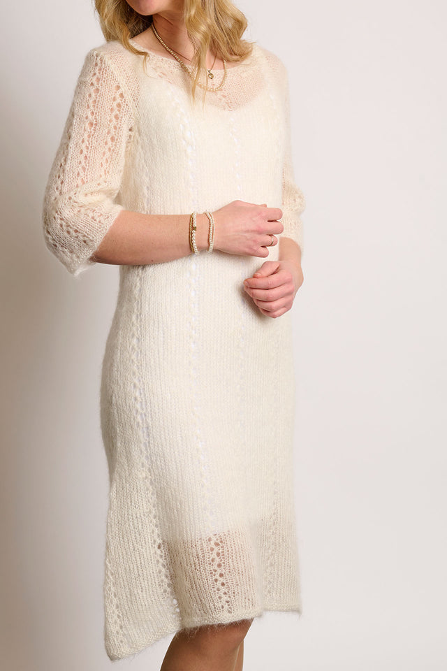 Mönstret är relativt enkelt, och det diskreta hålmönstret är en elegant detalj som passar perfekt till klänningens stil.