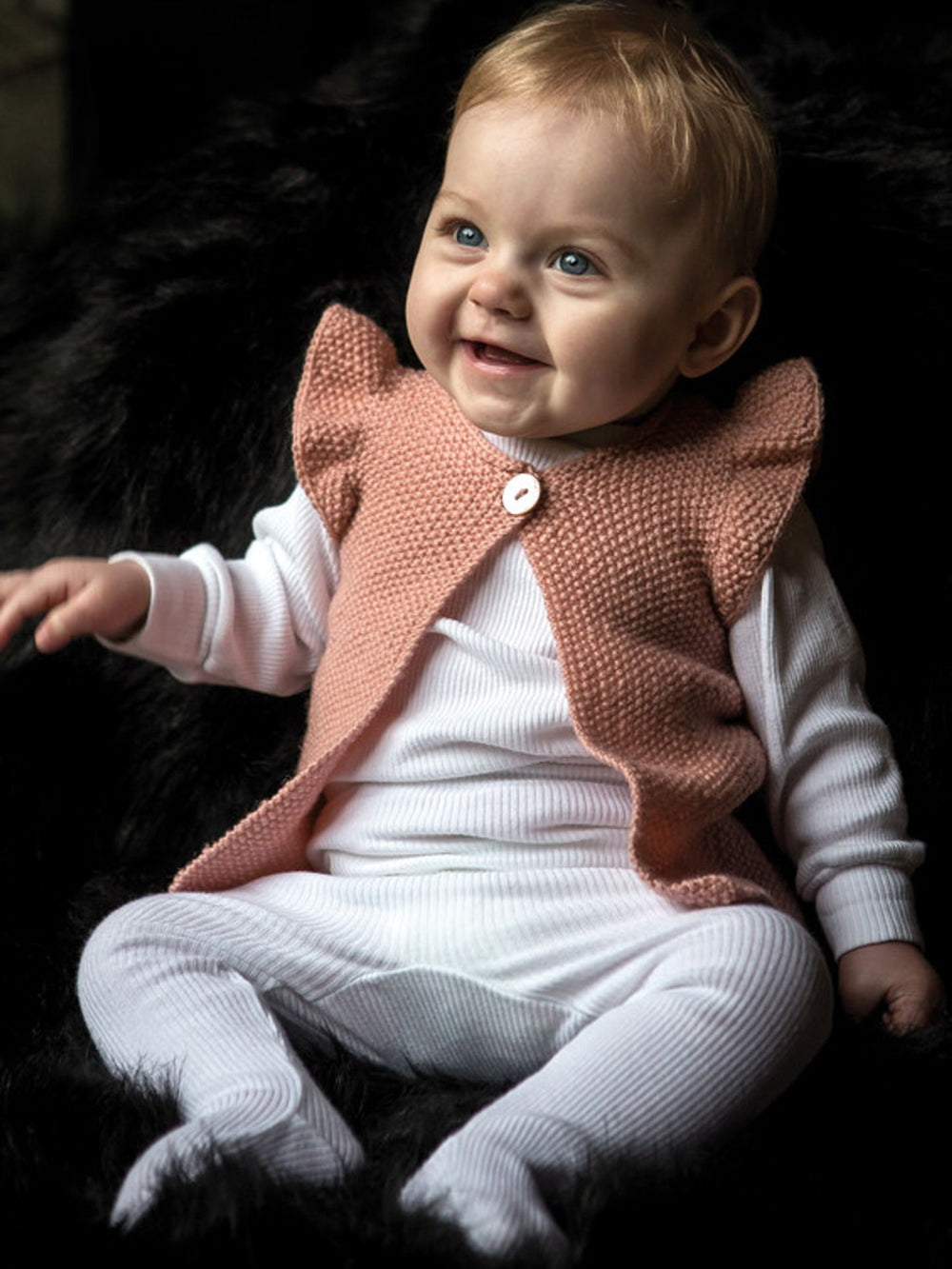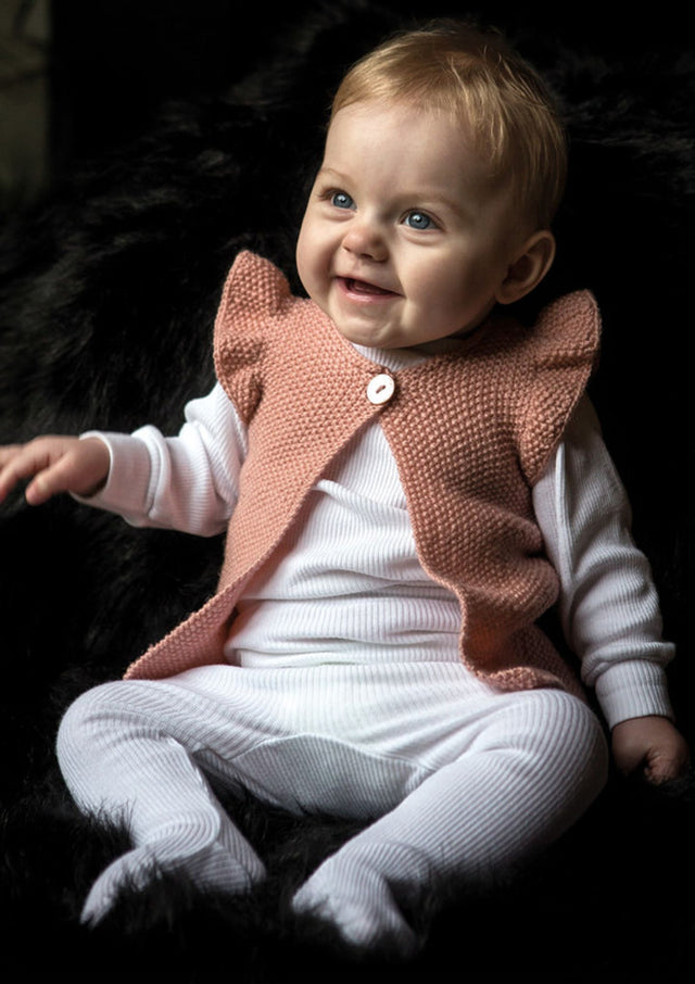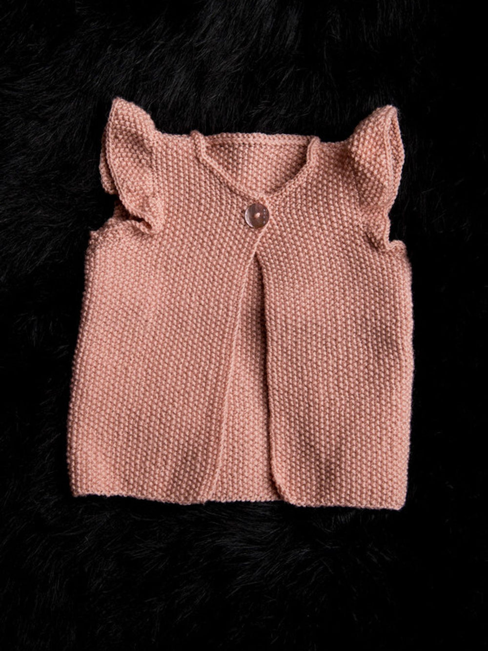 Bedårande väst med volanger på axlarna och en enkel knapp vid halsen.