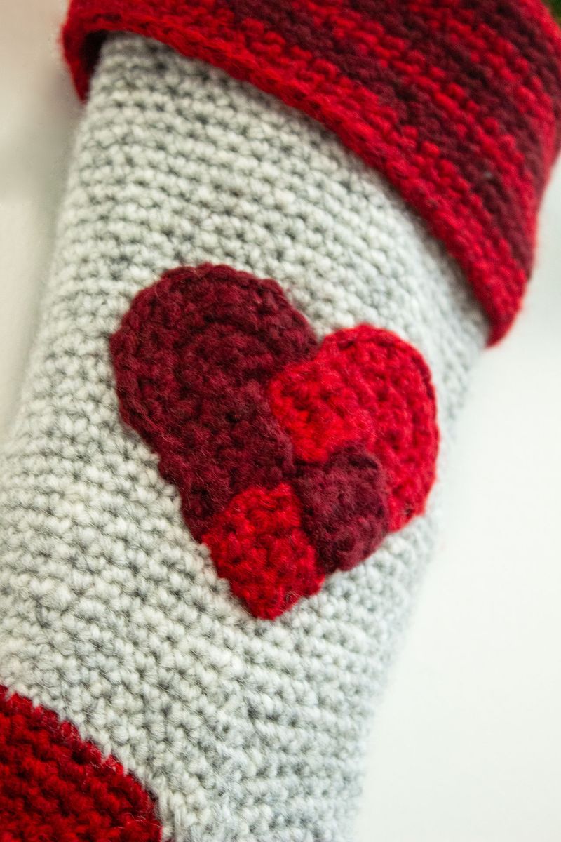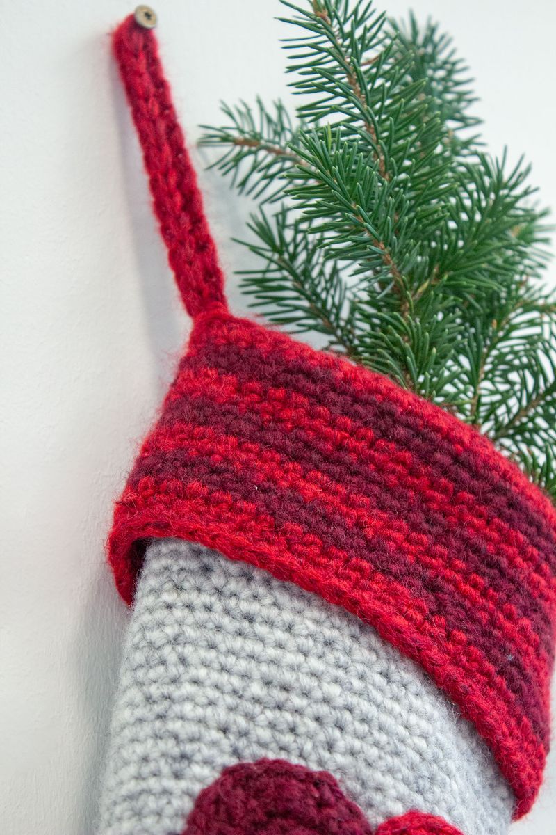 Den virkade julstrumpan har ett randigt mönster upptill och dekoreras på sidan med ett flätat hjärta.