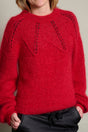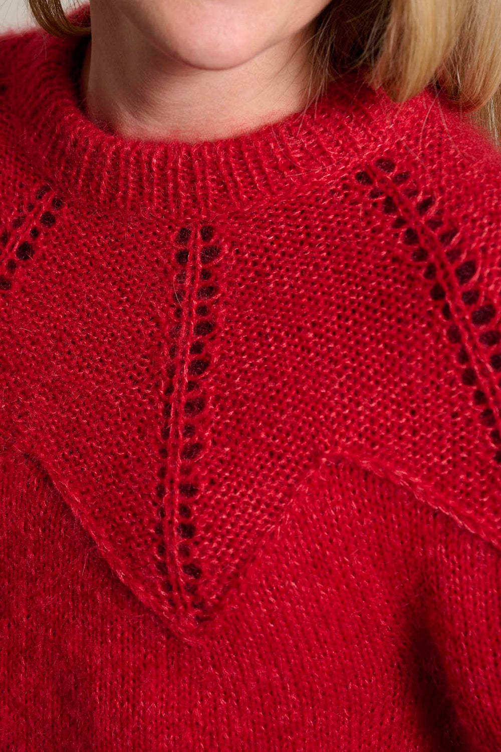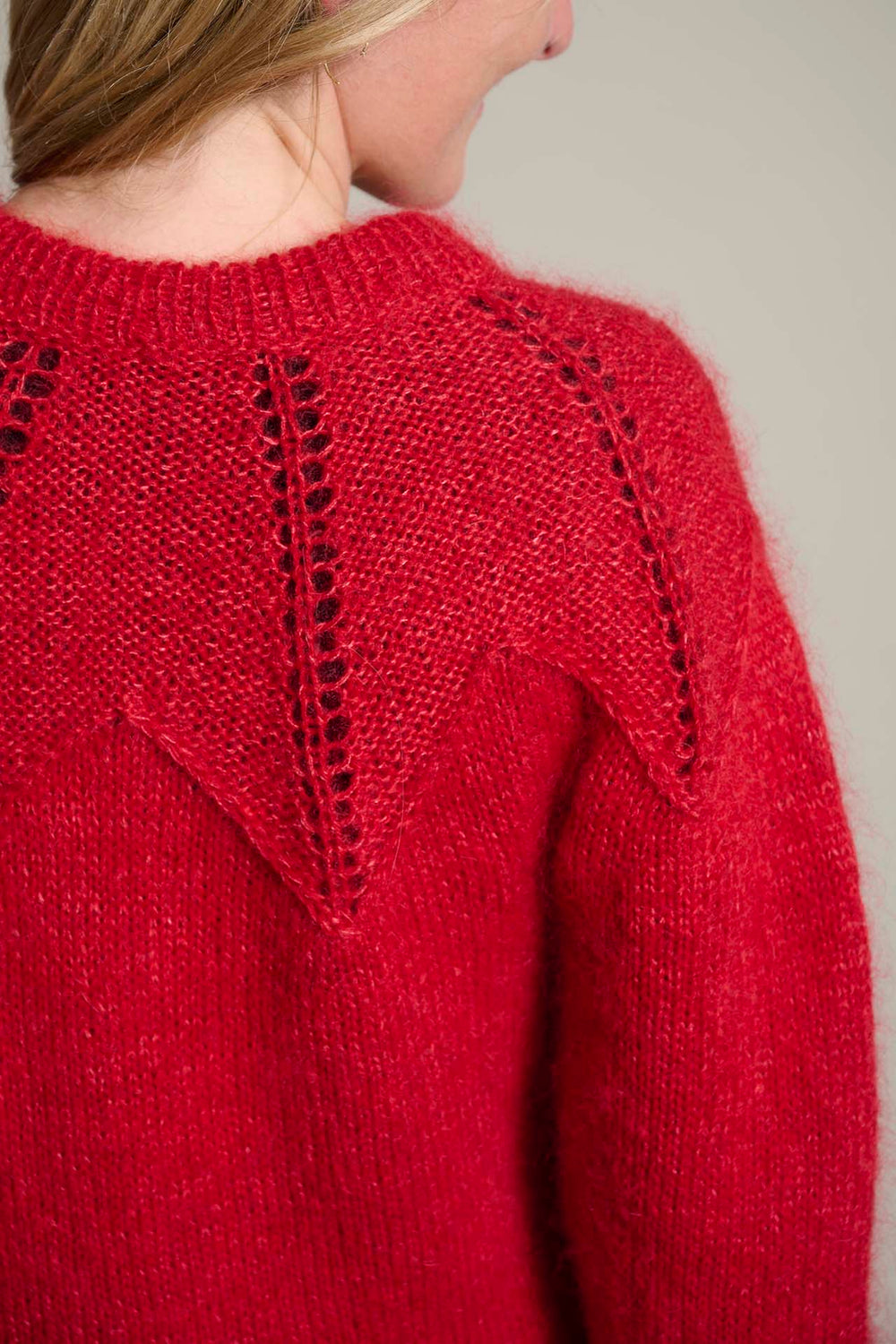 Tröjan stickas uppifrån och ner, där ökningar skapas med ett regelbundet hålmönster för att ge illusionen av en blomma i stjärnform. Blomman framhävs ytterligare med en vacker kant av vridna maskor som bildar en gräns mellan oket och resten av tröjan. För att skapa ännu mer kontrast är oket dessutom stickat i aviga maskor, medan resten av tröjan är slätstickad.